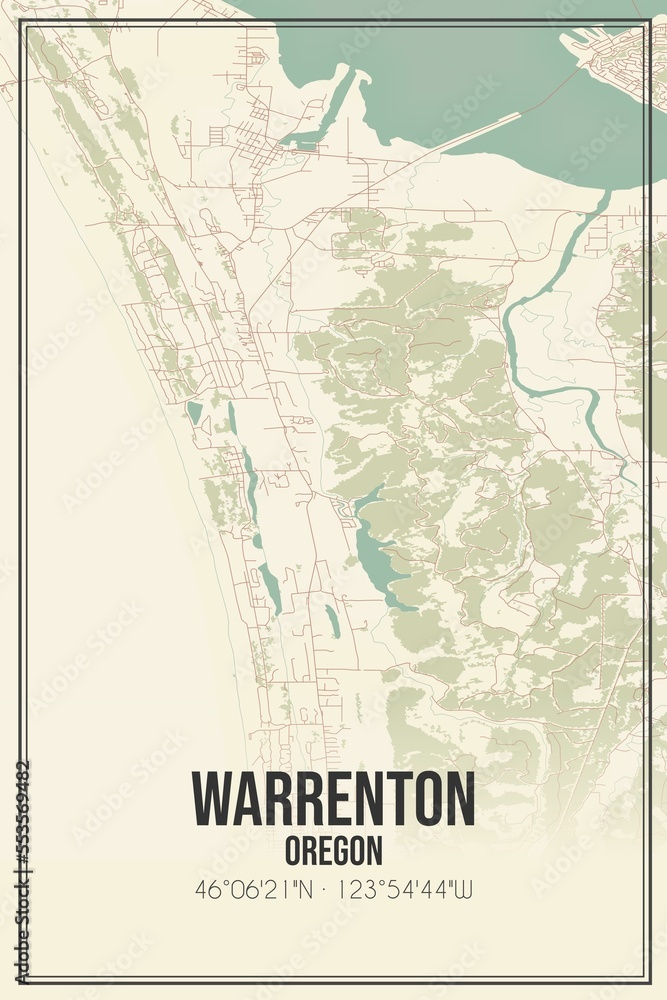 Retro US city map of Warrenton, Oregon. Vintage street map. Stock